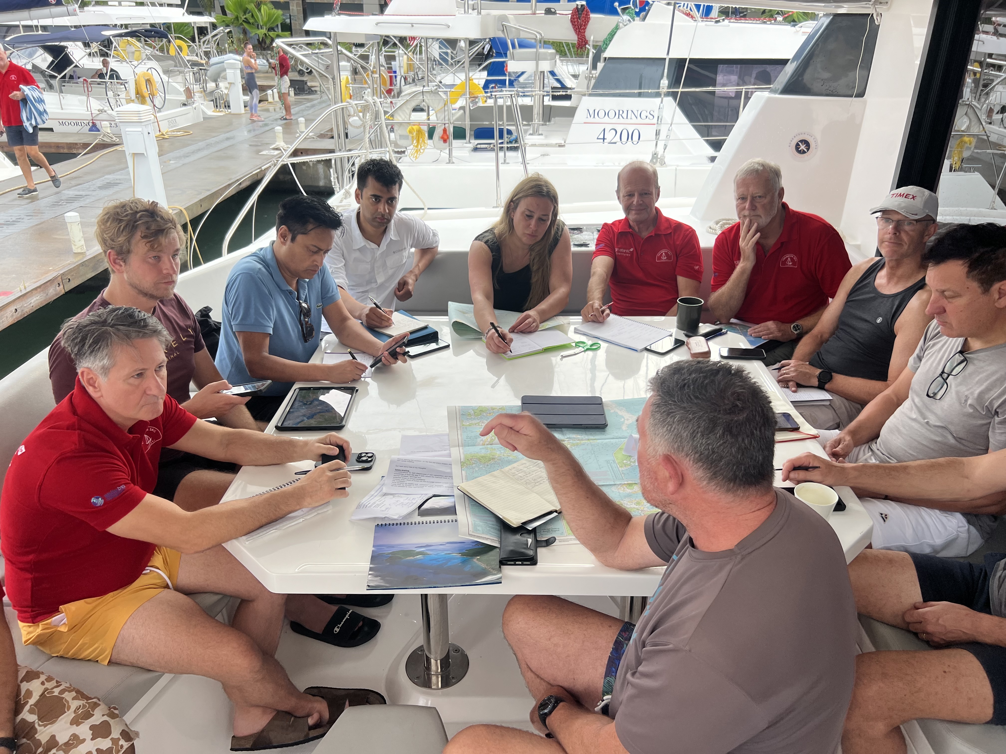 Today starts with a welcome briefing in the morning (sailing shirts on for the group photo!). All Skippers are required to attend a mandatory safety session covering all the legal and practical aspects of the adventure.
